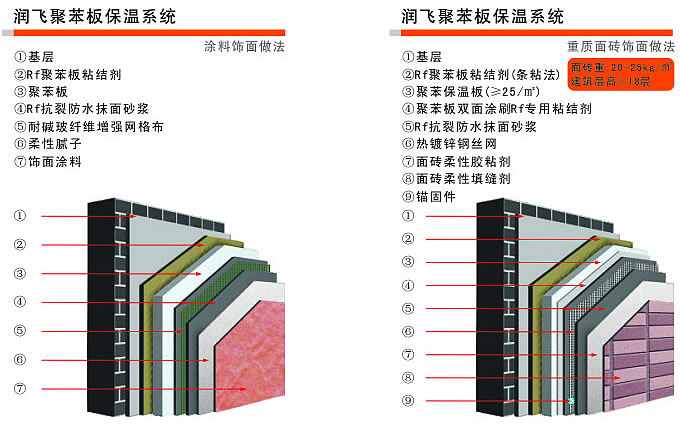 润飞外墙保温节能系统,有着多年的化工科研及应用基础的润飞化工实验室,集合了国内外聚合物的领先科技,经过多年的优化设计和实际应用,精作而成的符合现代需要的环保节能建筑保温材料。聚苯板粘接砂浆由可再复水固体乳液、高强度水泥、石英沙等配置而成,其主要用于RF外墙保温材料如聚苯板、挤塑板等与基层的粘结。